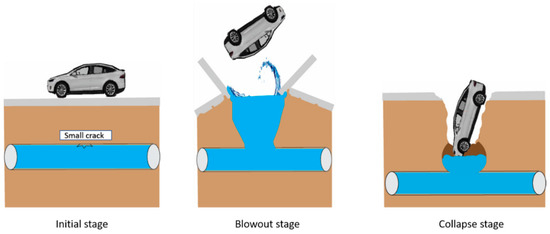 Natural and human-induced sinkholes are the two main categories of sinkholes that can be instantaneous and catastrophic. The human-induced sinkhole events are speedily increasing in recent decades, and they are the news headline of most national and international media [1]. Sinkholes are a significant hazard in many areas worldwide and are studied scientifically by [2,3,4]. The recent increase in sinkhole events due to water main defects necessitates the problem to be better understood, predicted and prevented. The water main damage-driven sinkhole is a significant concern in many metropolises across the globe. Several factors such as maintenance lack, water pressure increased, differential settlement, root damage and corrosion are responsible for causing the water main damage [1]. Table 1 presents some of the latest sinkhole events that occur across the globe [5,6,7,8].
