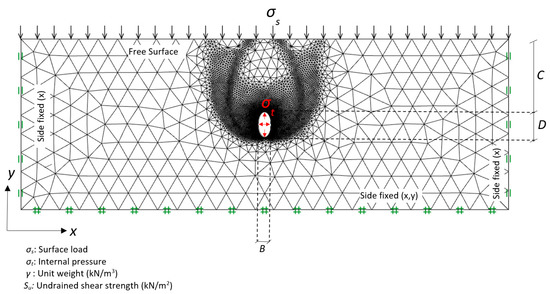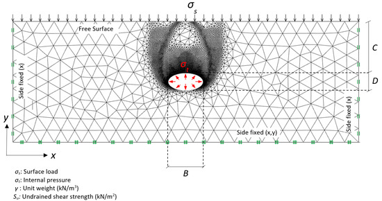 where a = B/2, b = D/2 and x and y are coordinates of an ellipse. Using Equation (1), a typical adaptive FELA mesh is shown in Figure 2 for a width to height ratio B/D = 2, whilst in Figure 3 for width to height ratio B/D = 0.5. In both cases, the trapdoors have a cover (C), depth (D) and width (B). The inner perimeter of the opening is exposed to a pressure acting perpendicular throughout the inner face (σt), whereas the ground surface is exposed to a surface pressure (σs). The soil is considered as a rigid-perfectly plastic Tresca material with the soil unit weight γ, and the undrained shear strength of the soil Su. The domain size was chosen carefully to diminish boundary effects of all sides in view of the overall development of velocity field. Note that both left-hand and right-hand sides are kept stationary in the x-direction and the bottom of the domain is fixed in both x and y directions. The nodes on the ground surface are free to move in all directions.