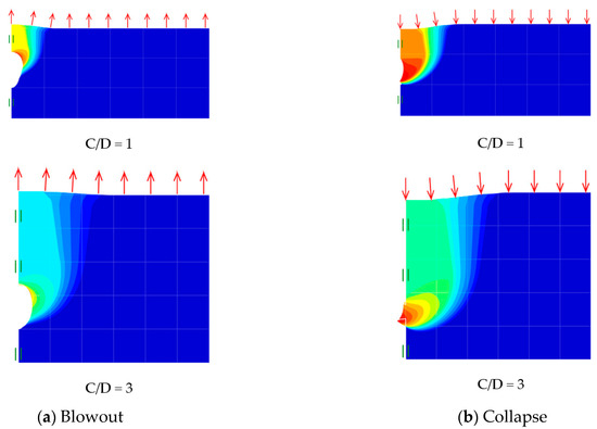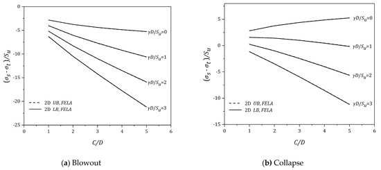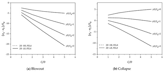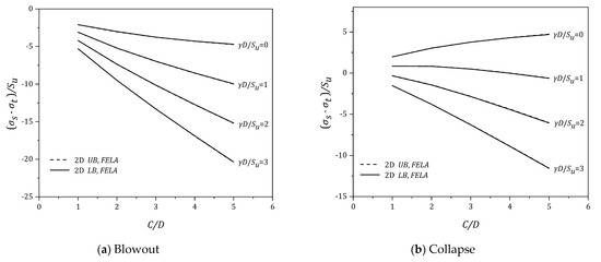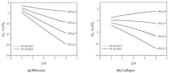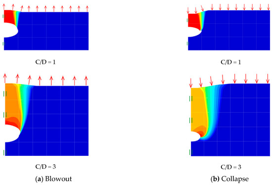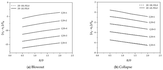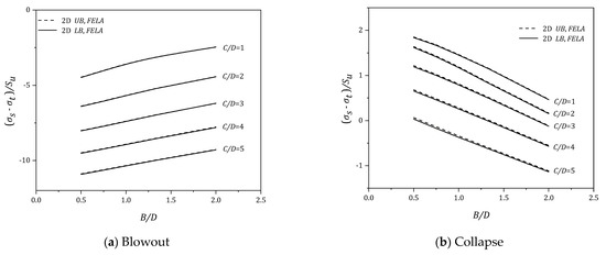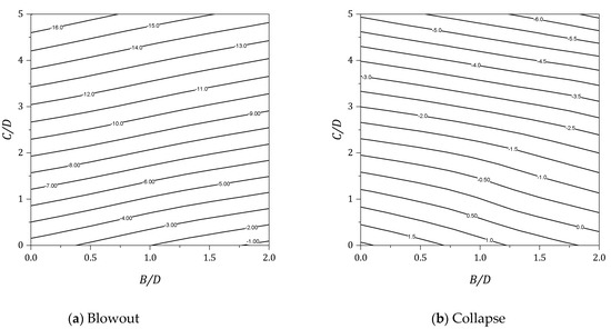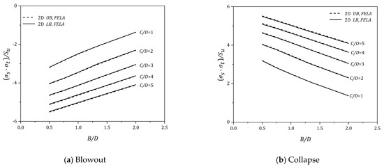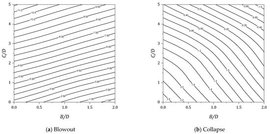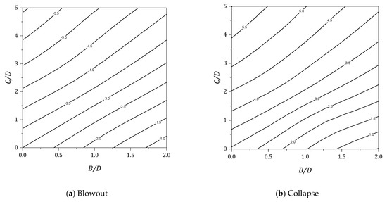 In contrast, for the weightless collapse scenario, the PR values are always positive, i.e., (σs) must be greater than (σt) to cause a collapse. Numerical results in Figure 4b have shown that the pressure ratio (PR) decreases with increasing (B/D) for all the depth ratios (C/D). Furthermore, the soil stability increases as the depth ratio (C/D) increases. A symmetrical result can be found from both the collapse and blowout solutions.