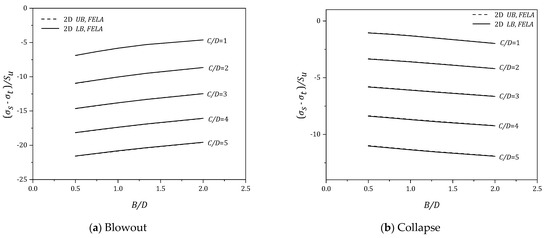 Following Davis’s approach, the current paper formulates numerical solutions using the critical pressure ratio for wide ranges of dimensionless parameters. A range of depth ratios (C/D = 1–5), width to height ratio (B/D= 0–2) and shear strength ratio (γD/Su = 0–3) are studied for both blowout and collapse scenarios. The objective function is to determine the lower and upper bound limits of the critical supporting pressure (σt) with selected input parameters (C, D, B, σs, γ and Su). The obtained (σt) from the numerical analyses are substituted into Equation (3) to calculate the critical pressure ratio (PR).