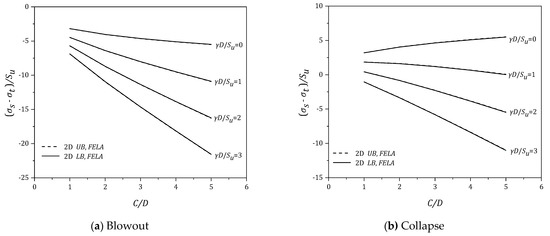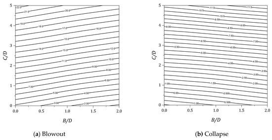 Using the same data, the effects of (C/D) are presented in Figure 8, Figure 9, Figure 10, Figure 11 and Figure 12. In general, for the blowout scenario (Figure 8a, Figure 9a, Figure 10a, Figure 11a and Figure 12a), the absolute values of the pressure ratio {PR = (σs − σt)/Su} increases as (C/D) increases. Note that the rate of increase (in negative PR) is greater as (γD/Su) increases. The finding is applicable to the various values of (B/D) of the blowout cases. Similar trends can be found in the collapse scenario (Figure 8b, Figure 9b, Figure 10b, Figure 11b and Figure 12b), where larger σt (in negative PR) is expected to support the soil as (γD/Su) increases. Furthermore, the larger the (C/D), the larger the σt (in negative PR) is. Design charts for assessing the blowout and collapse stability for various strength ratios (γD/Su = 0–3) are presented in Figure 13, Figure 14, Figure 15 and Figure 16, in which the x-axis represents the width to height (B/D) and the y-axis represents the depth ratio (C/D). One would need to input the “designed” parameters (B/D) and (C/D) to obtain a critical pressure ratio (PR) directly from the charts.