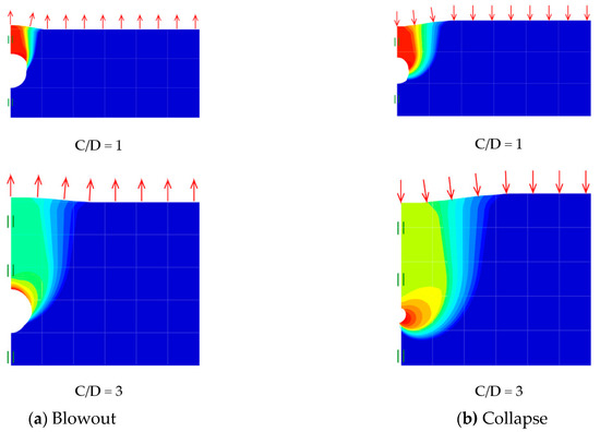 Contour plots of the absolute velocity fields of the elliptical cavity shape transformation are presented in Figure 17, Figure 18 and Figure 19 for various width to height ratios (B/D = 0.5, 1 and 2). These plots are both blowout and collapse modes with a shear strength ratio (γD/Su = 2) and two depth ratios (C/D = 1 and 3). In general, the failure extent in the collapse mode is greater than that in the blowout mode. This observation is supported by noting the location of the initial slip surface points from the inner cavity (see Figure 19). A chimney-type of failure is presented for the shallow depth ratio C/D = 1 in both the blowout and collapse scenarios and larger lateral expansions are seen in the deeper case C/D = 3, which supports the fact that greater σt is needed to cause soil blowout failure or to prevent soil collapse. Noting that the absolute values of the coloured velocity fields are not real for such a perfectly plasticity soil model, and therefore they are not presented here.