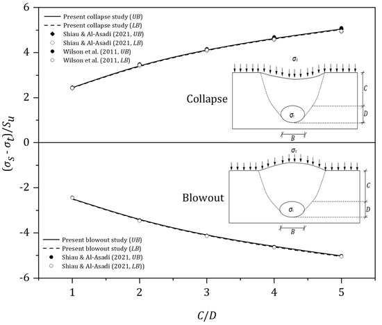 Since there was no previous study on the soil stability of elliptical-shaped cavity under blowout condition, the comparison in Figure 20 is made by using previous circular cavity results (i.e., B = D) in either blowout or collapse scenarios. To compare the current pressure ratio (PR) with the critical stability number (Nc) in Shiau and Al-Asadi [35], a weightless soil condition (γD/Su = 0) is needed. In this way, our pressure ratio (PR) is equal to the (Nc) reported in Shiau and Al-Asadi [35]. The comparison shows a good agreement between Shiau and Al-Asadi [35] and the present study for the blowout study. Similarly, for the collapse study, it also shows a good arrangement amongst Shiau and Al-Asadi [35], Wilson et al. [36] and the present study. This comparison has greatly enhanced the confidence with the numerical results presented in the paper. An example is given next to explain how to use the design charts.