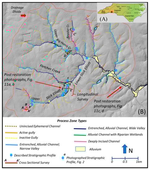 (A) Map showing the location of the Big Harris Creek basin in North Carolina; (B) Spatial distribution of the seven defined process zones within the basin and the location of the described stratigraphic sections. Mapped areas of alluvium characterized by legacy sediments overlying precolonial deposits. North Carolina map from the USGS. LiDAR DEM from the North Carolina Spatial Data Download Center (https://sdd.nc.gov/, accessed on 10 October 2021). See Table 1 for process zone characteristics. Figure S1 and Table S1 provide the location and descriptions of specific stratigraphic sections.