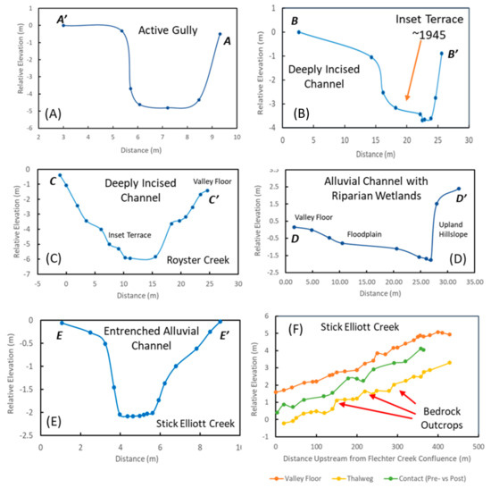 Representative topographic surveys across the major process zones defined within the project area, including (A) an active gully at the headwaters of Stick Elliott Creek, (B,C) deeply incised channels, (D) an alluvial channel with riparian wetlands located along the axial channel of Big Harris Creek, and (E) an entrenched alluvial channel along Stick Elliott Creek; (F) a longitudinal profile along the lower reach of Stick Elliott Creek shows the relationship between the contemporary channel bed (thalweg)(yellow line), the valley floor (orange line), and the contact between the legacy and precolonial deposits (green line). See Figure 1 for survey locations.