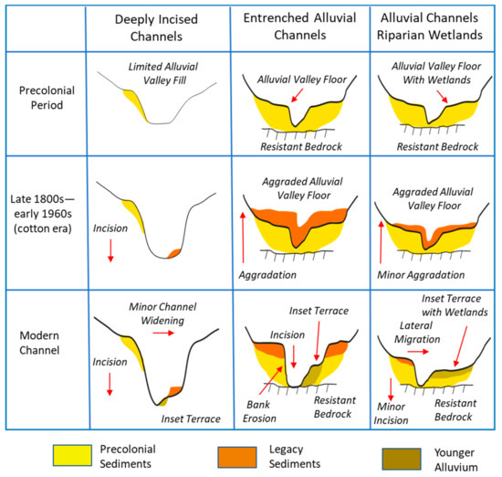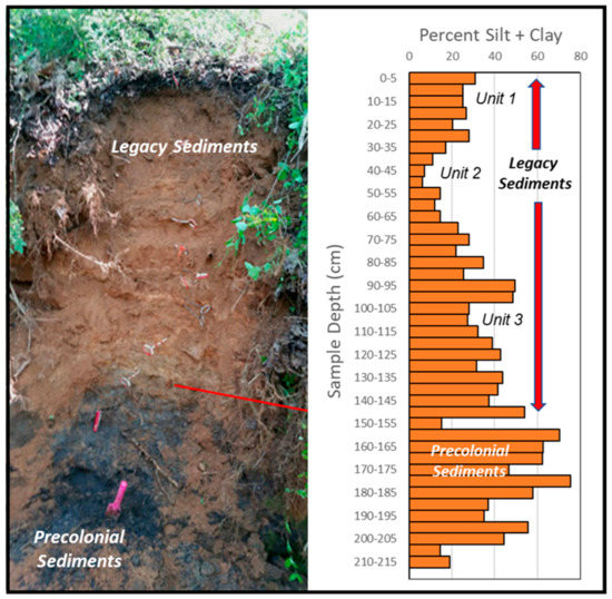 Recent geomorphic and alluvial stratigraphic studies have demonstrated that, in most environments, humans currently represent the primary driver of geomorphic change, the rates of which are generally orders of magnitude greater than those associated with natural geomorphic processes [1,2,3,4]. Kemp et al. [4], for example, found by analyzing more than 4000 documented rates of sediment accumulation that alluvial deposition in North America was roughly stable for the past 40,000 years before increasing by about 10-fold in response to the anthropogenic disturbances associated with European settlement. The dramatic transition in geomorphic processes following European settlement is widely recognized by the occurrence of dark, organic-rich precolonial deposits that are abruptly overlain by historic sediments [1,5,6,7,8,9,10,11,12,13,14]. In fact, the occurrence of these historical, anthropogenically derived deposits is so pervasive that they are now referred to as post-settlement deposits or, more commonly, legacy sediments (see James [15] for a detailed review of their definition).