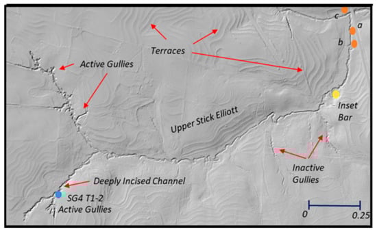 Dendrochronological methods were used to determine (1) the approximate timing of valley floor and terrace stabilization and (2) the rates of bank erosion. Thirty-two tulip poplar trees (genus—Liriodendron) were cored along Upper Big Harris, Upper Stick Elliott, and Royster creeks as well as several tributaries (Figure S2) using a Swedish increment borer. Two cores were taken from each tree at approximately 1 m above the ground. At this height, the inner dates provide a minimum age for the surface. Generally, two to five years can be added to each inner date to estimate tree germination on the surfaces. For this study, the inner dates were used as the best estimate for dating and grouping of the data for analysis, and ages were defined as years before 2017. Following core collection, the cores were mounted, prepared, and cross-dated at Western Carolina University using skeleton plots according to procedures described by Stokes and Smiley [40]. Decadal-scale, bank erosion rates were determined by measuring the amount of erosion that had occurred around the roots of dendrochronologically dated trees growing along the upper edge of the channel banks (patterned after Hupp and Bornette, [40]). More specifically, bank erosion rates were estimated for 17 trees by dividing the amount of erosion by the determined age of the tree, where the amount of erosion was defined as the distance from the channel bank to the most distant root exposed within the channel (Figure S3). The amount of measured erosion is a minimum of that which could have occurred at the site. Thus, the method provides a conservative (minimum) estimate of erosion rates.
