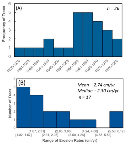 (A) Histogram showing the variation in the approximate age of the trees on the valley floor of entrenched alluvial channels. Age does not account for collection of tree cores at ~1 m above ground. Exact date of germination is likely to be 2–5 years prior to date shown; (B) rates of bank erosion estimated from tree age and width of exposed tree roots from channel banks. Includes trees from along Stick Elliott Creek, Upper Big Harris Creek, and Royster Creek. Figure updated from Miller et al. [25].