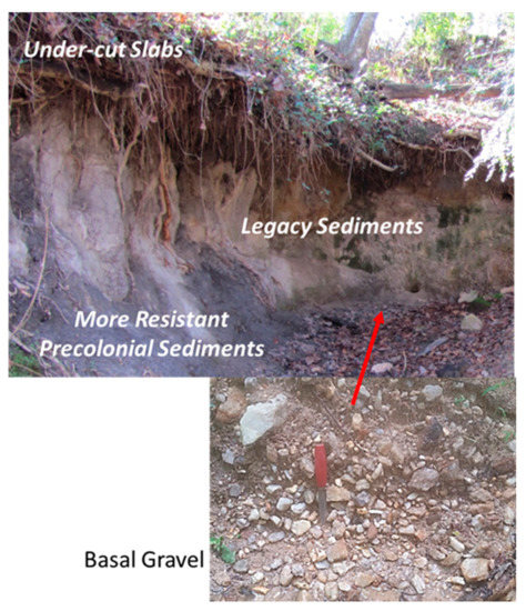 - Dearman, T.L.; James, L.A. Patterns of Legacy Sediment Deposits in a Small South Carolina Piedmont Catchment, USA. Geomorphology 2019, 343, 1–14. [Google Scholar] [CrossRef]