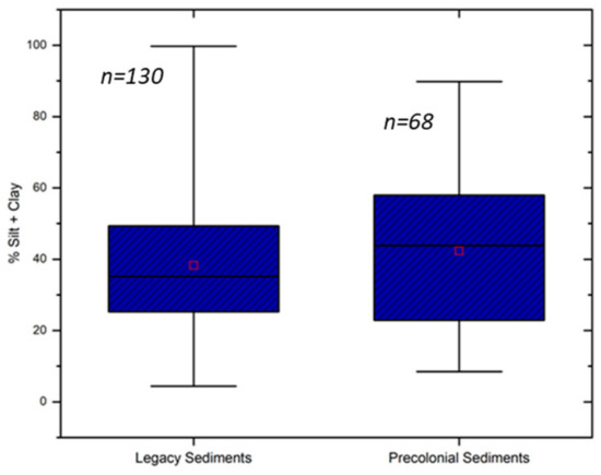 Comparison of the fine-grained sediment content of the precolonial and legacy sediments along entrenched alluvial channels. Box represents 25–75% of samples; horizontal line is the mean; small square is median; whiskers represent maximum and minimum values.