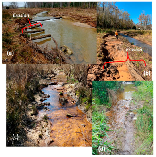 (a,b) Erosion that occurred along the lower reaches of Big Harris Creek near the downstream terminus of the project. Bank erosion was presumably enhanced by the relatively erodible nature of the sandy legacy deposits (or reworked legacy deposits) that form the channel banks; (c,d) exposed precolonial deposits along bed of reconstructed channel of Stick Elliott Creek. Note that knickpoints developed in the resistant precolonial deposits.