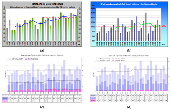 In addition to the already complex situation, the effects of the changing climate are evident in the region. During the period 1993–2019, the 132 meteorological stations of the Regional Agency for Environmental Protection and Prevention of Veneto (ARPAV) network registered an increase in the mean temperature of about 0.5 °C per decade (Figure 2a). Furthermore, during the period 1993–2020, the 160 rain gauge stations of the ARPAV network registered a considerable variability of the annual precipitation with alternation of drought situations to situations of pluviometric surplus (Figure 2b). Such anomalies are less visible in the coastal provinces (Figure 2d) than in hilly and mountainous provinces, where the number of days with intense precipitation is higher (Figure 2c).