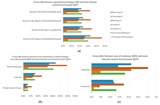Lastly, the perception of the most relevant current local hazards (Q19) was related to the expected local changes (Q6), to the perceived local importance of climate change over other hazards (Q20) and the area of residence (Q32). Figure 3 represents the resulting cross tabulations. In general terms, hydrological hazards are perceived as the most relevant ones, regardless of the feared future effects of climate change (Figure 3a). Nevertheless, hydrological phenomena are recognized, especially by those who show awareness of future meteoclimatic impact (highest percentage, 46.4%). These same respondents also reported the highest responses to future meteorological events (highest percentage, 32.5%), although there is a shared agreement among the respondents on the relevance of these events, as meteorological events always reach the second highest percentage. The only exception are the respondents most concerned for the impact on human assets, who consider environmental and biological hazards (30.0%) as most relevant after the hydrological ones (32.4%) and before meteorological ones (21.8%). This indicates that those who are especially focused on the effects of the climate crisis also recognize the related impact on the geological and hydrological processes, whereas those who are less worried about climate change tend also to discard their secondary effects.