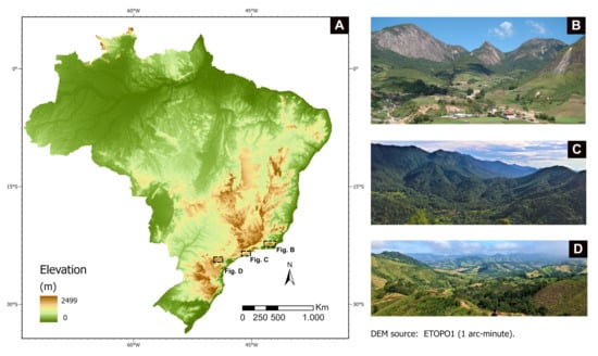 Geomorphological characteristics of Brazil and examples of mountain regions. (A) Elevation of Brazil. (B) Rio de Janeiro mountain range (Source: Marcelo F. Gramani); (C) Serra do Mar in Caraguatatuba, São Paulo; (D) Serra do Mar in Itaóca, São Paulo (source: Vivian Dias).