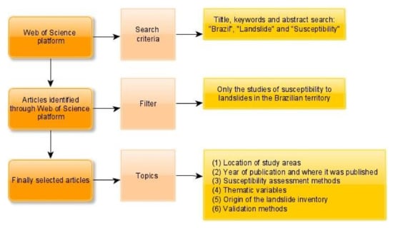 We applied a systematic search to find publications about susceptibility assessments in Brazil (Figure 2), using one of the main and largest bibliographic repositories commonly used in several geoscience studies [21,22,23,24], the Web of Science™(WoS), as of April 2021. Journals and other publication media indexed in the WoS need to fulfill several quality criteria; thus, by relying on the WoS it can be expected that the identified articles correspond to a certain scientific standard. Publications not listed in the WoS were not considered in this study since this would have required an extensive manual search, wherein a complete and objective coverage of studies would have hardly been possible.