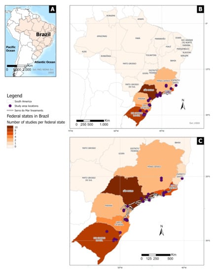 Location of the study areas in Brazil. (A) Overview map of South America; (B) locations (federal states) of the landslide susceptibility studies in Brazil. São Paulo is the state with the highest number of publications (10), followed by Rio Grande do Sul (8), and Rio de Janeiro (7); (C) location of Serra do Mar escarpments and study areas.
