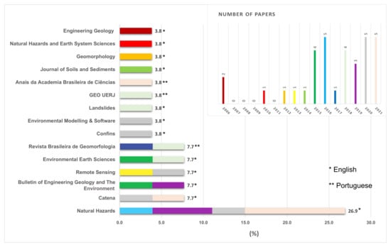 The articles were published in 15 different geosciences journals (Figure 5). The journals address several topics, such as geology, geomorphology, and remote sensing. We found that 73% of the articles were published in international journals in the English language. According to Carrera et al. [55], in Latin America 48.8% of all publications were in English, followed by Spanish (43.1%). These numbers show that Brazilian researchers tend to publish in English rather than in Portuguese (the native language). Natural Hazards is the journal with the highest number of publications about susceptibility assessments in Brazil (≈27%), and it is among the five most common journals with publications related to landslides in Latin America [55]. According to Reichenbach et al. [54], Natural Hazards is also one of the journals with the highest number of publications about landslide assessments worldwide.