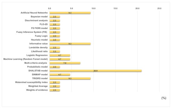 The publications applied 21 different susceptibility model types (Figure 6). About 37% were slope stability models: the Shallow Landsliding Stability Model (SHALSTAB) (20.9%), Transient Rainfall Infiltration and Grid-Based Regional Slope Stability (TRIGRS) (9.3%), Stability Index Mapping (SINMAP) (4.7%) and Safety Factor FIORI (SF FIORI) (2.3%) models. In general, slope stability models use hydrological, geomorphic and geotechnical input parameters, computation of safety factors (SFs), and in some cases they enable the construction of susceptibility scenarios based on rainfall thresholds [49]. SHALSTAB was the most frequently applied model [26,27,28,31,38,48,49,50,51]. It is a physically-based digital terrain model for mapping slope stability potentially related to landslides [56]. Two publications compared some of these models and assessed their performance: Ávila et al. [15] used TRIGRS and SF FIORI and concluded that TRIGRS leads to better results. Vieira et al. [28] compared SHALSTAB and TRIGRS, and concluded that both models were effective in predicting landslides. The first publication applying a slope stability model was published in 2010 [32], and the most recent was published in 2021 [15].