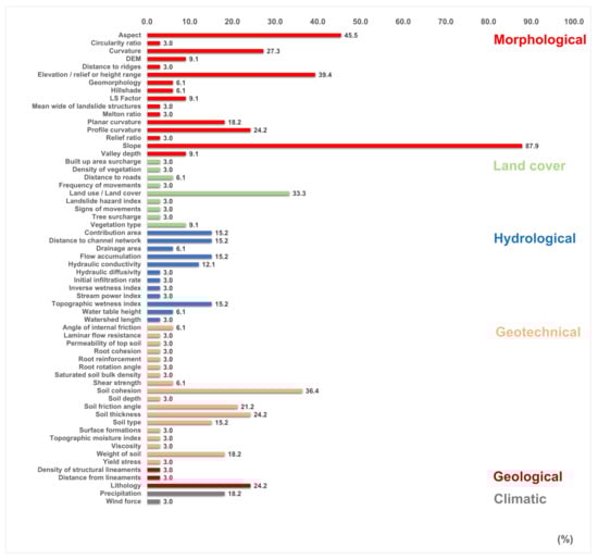 The thematic variable slope was used in approximately 88% of all publications, followed by aspect (45.5%), elevation (39.4%), soil cohesion (36.4%), and land cover (33.3%). Curvature (27.3%), profile curvature (24.2%), and planar curvature (18.2%) were also often used. Mechanical factors presented high percentages, reflecting the results regarding the most frequently used model, discussed in Section 3.3, i.e., SHALSTAB. This model requires mechanical factors, such as soil thickness (24.2%), soil friction angle (21.2%), and the weight of the soil (18.2%).