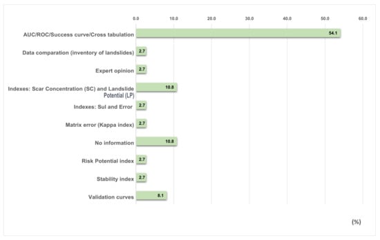 The validation of the landslide susceptibility mapping results is the final step in the analysis and enables the comparison of the mapping with other studies in Brazil and worldwide. Nine methods of validation were identified (Figure 9). Sometimes different names were used for the same validation procedure by the authors. We found that 54.1% of all publications applied area under the curve (AUC) (27%), receiver operating characteristic curve (ROC) (16.2%), cross tabulation (8.1%) and success curve (2.7%) analyses.