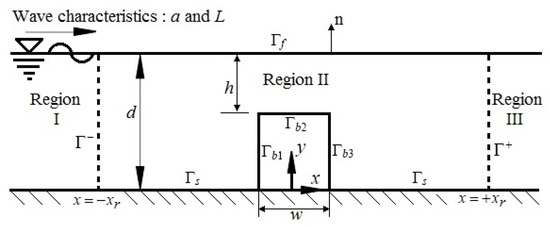 The idealized geometry of the two-dimensional (2D) problem in a Cartesian system (x-y) is shown in Figure 2. Regular waves of small amplitude a, period T, and wavelength L impinge from the left in water of depth d. Assuming an irrotational flow and incompressible fluid motion, the problem is formulated using a velocity potential where Re denotes the real part, is the time independent spatial velocity potential, is the wave angular frequency, and t is the time. The wave number is the solution of the dispersion relation , where g is the gravitational acceleration. The wave field is totally specified if the two-dimensional velocity potential is known.