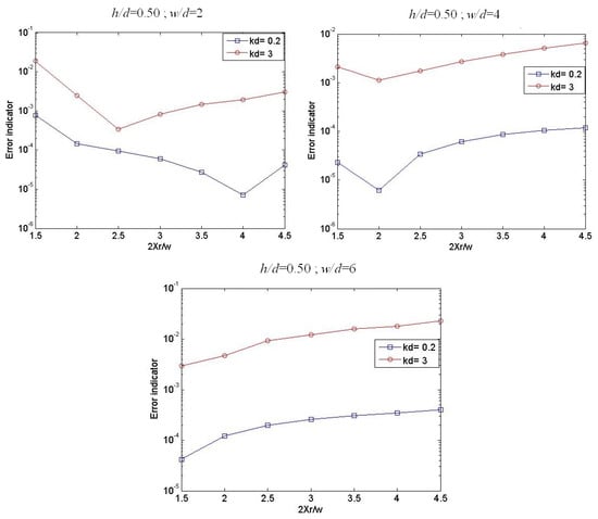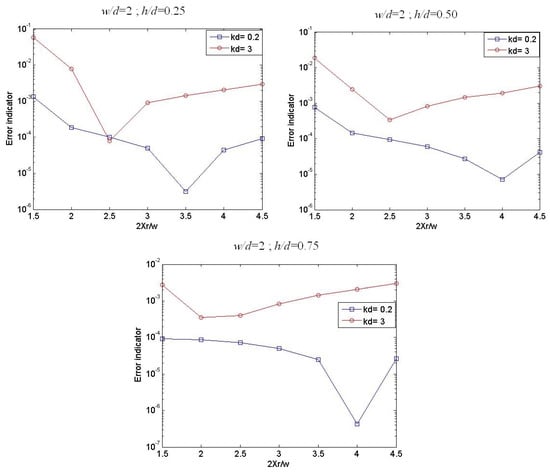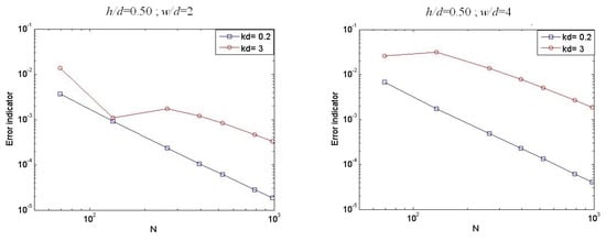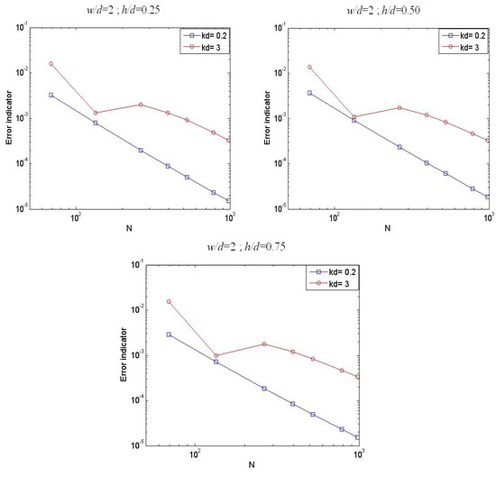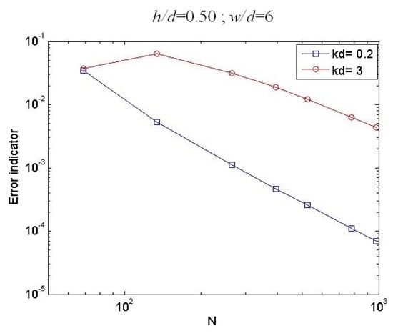 In Figure 4, we examine effects of the total number of boundary nodes N for a fixed relative length w/d = 2 and different immersion ratios, h/d = 0.25, 0.50, 0.75. In Figure 5 the immersion ratio is fixed at h/d = 0.50 and the relative length is varied, w/d = 2, 4, 6. These results show that, for narrow breakwaters (Figure 4), when the immersion ratio h/d is varied, a minimum number of boundary nodes N = 200 is required to ensure that computational errors are small and do not exceed 10−2. However, for wider breakwaters (Figure 5), the total number of boundary nodes is recommended to be at least N = 600 to guarantee that the computational errors remain below 10−2.