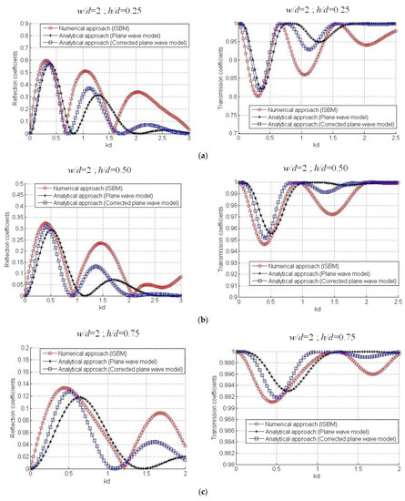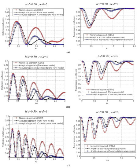 Variations of reflection and transmission coefficients by fixing the immersion ratio at h/d = 0.50 and varying the relative length: (a) w/d = 2, (b) w/d = 4, and (c) w/d = 6.