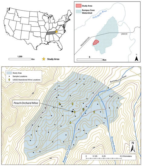 The abandoned Peach Orchard Mine is situated in the middle of the study area at the southwest end of the cove in the vicinity of Bumpus Cove Creek. Additionally, five other abandoned Pb, Zn, and Mn mines are centralized in the study area and operated simultaneously during the same time (Figure 1). No additional mapped mines are located upstream of the study area.