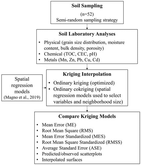 Magno et al. (2019) [22] describe statistical analyses and development of spatial regression models for the metals (Mn, Zn, Pb, Cu, and Cd) using physico-chemical characteristics of the soil samples. This research builds upon that analysis using the findings to select variables for cokriging interpolation models and to select an appropriate neighborhood size. The findings of the prior research are summarized in Table 1 and list the explanatory variables retained in spatial regression models and the neighborhood size of the spatial weights matrix.