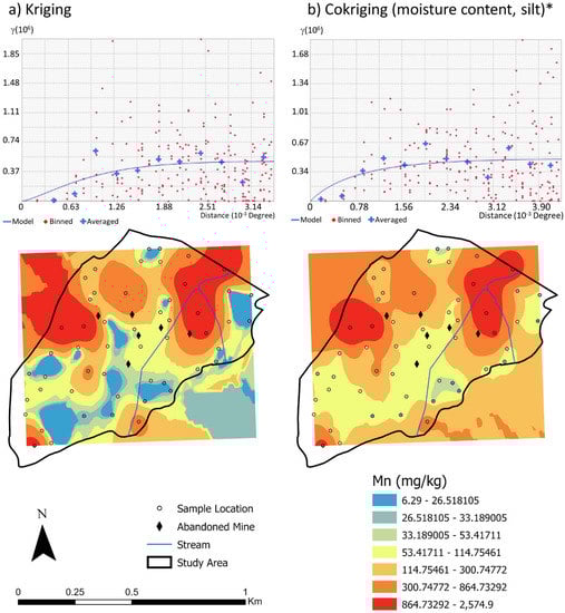 Variograms and interpolated Mn concentration using ordinary kriging (a) and cokriging (b). The cokriging model, marked with an asterisk, was selected as the superior model.