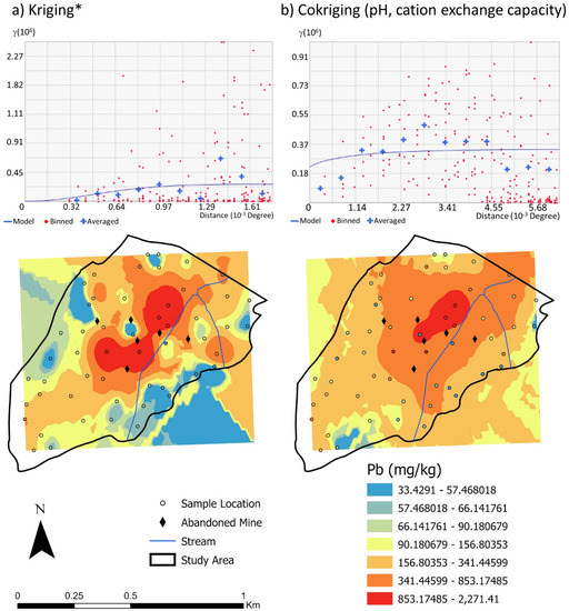 Variograms and interpolated Pb concentration using ordinary kriging (a) and cokriging (b). Kriging model, marked with an asterisk, was selected as the superior model.