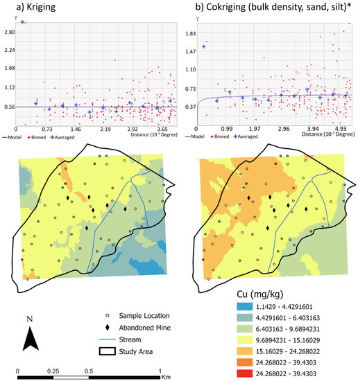 Variograms and interpolated Cu concentration using ordinary kriging (a) and cokriging (b). Cokriging model, marked with an asterisk, was selected as the superior model.
