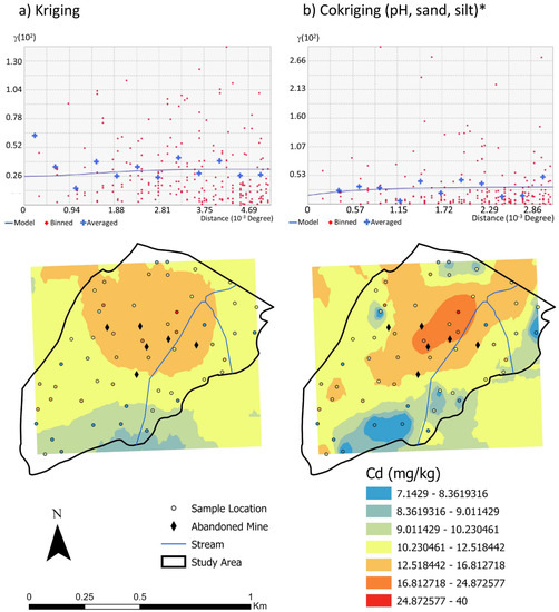 Variograms and interpolated Cd concentration using ordinary kriging (a) and cokriging (b). Cokriging model, marked with an asterisk, was selected as the superior model.