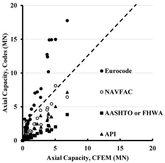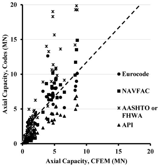 In the case of drilled (bored) piles, Figure 3 shows that most axial capacities calculated by the CFEM method are lower when compared to the Eurocode, the API, and the NAVFAC methods. However, the CFEM was found to produce a slightly higher capacity than the ASHTOO/FHWA design method. Figure 4a presents a comparison between the pile capacities determined from the field results and the theoretical axial capacity calculated using the CFEM method. It can be noted from Figure 4a that most of the CFEM calculated pile capacities are lower than the actual capacities obtained from the field methods and are very close to capacities determined according to the Decourt [25] method. Likewise, it can be seen from Figure 4b that the average capacities for all field methods are higher than the capacities calculated by the CFEM. Hence, it can be concluded that the axial load capacities for drilled piles calculated using the CFEM method are within a conservative range of the actual capacities.