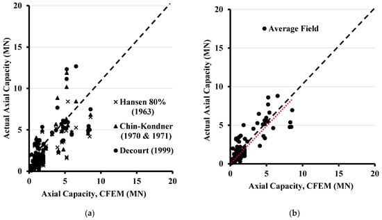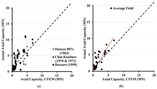 Comparison between the theoretical axial capacity in drilled (bored) piles determined using the CFEM method and (a) the field results, and (b) the average field results.