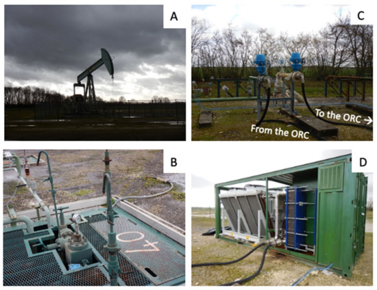 The small-scale mobile Organic Rankine Cycle (ORC) unit installed at Chaunoy oil field. (A): one of the oil wellheads, (B): head of the CNY40 well from which the oil and hot water are extracted, (C): the connection of the hot water pipe to the ORC unit, (D): the mobile ORC unit connected to the water pipe. The samples tested at Chaunoy in this work were placed within the inlet of the ORC unit during a 4-month demonstration.