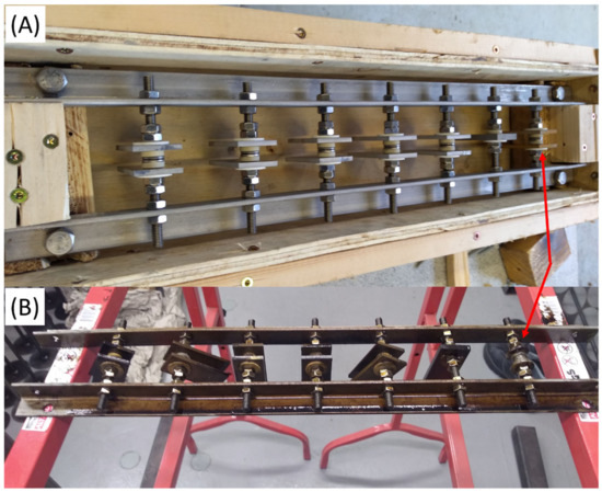 (A): The samples on a rack which was inserted into an oil flowline at Chaunoy. (B): The rack and samples after testing had been conducted. It is interesting to note that two carbon steel coupons, which are not investigated in this work, had corroded severely, and fallen off of the threaded rod during exposure as marked with red arrows.