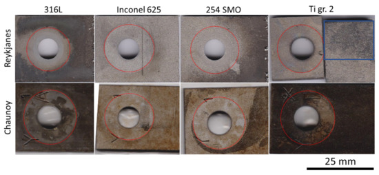 Visual appearance is the first indicator of material performance after exposure and the photocopied samples can be seen in Figure 5. Where the coupons were fastened to the rack, marked with a red circle, there was an area which was masked, sometimes partially, from the geothermal environment. Utilising masked areas as a reference in corrosion exposure has been reported [58]. The difference in surface appearance between the exposed areas compared to the masked areas was evident for 316L, 254SMO, and Ti gr. 2 tested at Reykjanes. It is important to note, due to the testing set-up, that only the area, marked with a blue box, of Ti gr. 2 was exposed. Inconel 625 did not show visible discoloration after being exposed at Reykjanes. The discoloration formed at the surface of the 316L, 254SMO, and Ti samples tested at Reykjanes was well adhering. The samples exposed at Chaunoy had an indication of fluid deposits where layers had loosely formed on the surfaces of the samples with low adherence.