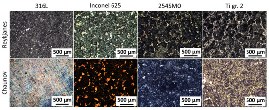 The macroscopic topography evaluation of the tested samples gave an indication of the general surface texture of the samples which can be seen in Figure 6, where high roughness is evident for 254SMO and Inconel 625. There was a surface texture difference within 316L exposed at different locations which might partly be due to a different provider.