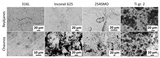 Similar to the topography images, seen in Figure 7, the microscopic cross-sectional images, seen in Figure 8, contained micro roughness for 254SMO and Inconel 625. The 316L tested at Chaunoy had a smooth surface with a defect of around 5 µm into the subsurface containing corrosion deposits. The Reykjanes-exposed 316L sample had unhomogenized corrosion layers covering the surface. The 254SMO had subsurface cracks after exposure in Reykjanes and Chaunoy while Inconel 625 had subsurface cracks only for samples tested in Chaunoy. Both 254SMO and Inconel 625 contained high amounts of Ni and Mo. Furthermore, there was the presence of inclusions within both materials contributing to weak areas.