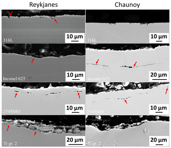 Scanning Electron Microscope (SEM) cross-section images taken of the most affected areas detected after exposure in both locations. The arrows indicate areas of interest: corrosion layer for 316L (Reykjanes), subsurface cracks for Inconel 625 (Chaunoy) and 254SMO (Chaunoy and Reykjanes), and abrasion of Ti gr. 2 surfaces (Chaunoy and Reykjanes).
