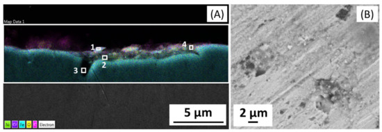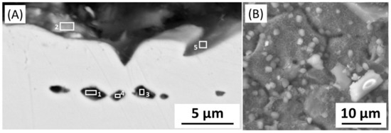 Unlike after exposure in Reykjanes, the 316L after exposure in Chaunoy, which had a pH level of 7, did not show the same corrosion layer formation. However, there were local defects scattered over the surface as seen in the topography image in Figure 10A. Furthermore, defects were seen in the cross-section images, Figure 10B. The elemental analysis of locations shown in Figure 10A is detailed in Table 6. There were traces of S and Si from the exposure found within corrosion deposits at the defects. The deposits mainly consisted of Fe, O, and Cr. Traces of Al were found, which can be a typical inclusion material in stainless steels [61].