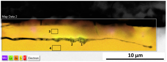 Inconel 625 is a Ni-alloy used within the geothermal sector and is recommended for sulphur rich environments [62]. Figure 11 shows locations of the chemical and microstructural analysis of Inconel 625 after exposure in Reykjanes. Table 7 details the chemical analysis of the locations analysed in the figure. A horizontal crack was detected within the material after exposure. The crack contained O and a high ratio of Cr/Ni was measured at 1.4–1.8 while the base material had a ratio of 0.3. Furthermore, the Mo/Ni ratio was slightly higher in the crack. The results indicate that when the crack is formed, Cr and Mo will diffuse into the crack and together with oxygen seal it. A trace of S was also found within the crack. The surface seemed to be unaffected by the exposure which is reflected in Figure 5 where the exposed sample contains a similar appearance to the masked area.