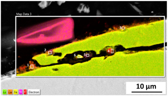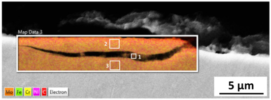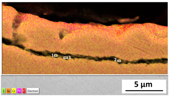 Higher magnification of the crack in the area marked with blue in Figure 15B, is shown in Figure 16 and an elemental analysis of locations in the crack is presented in Table 10. Within the crack was a high ratio of Cr/Fe, or 0.6–0.8, compared with the bulk material and voids at the subsurface with around 0.4 Cr/Fe ratio. Like Inconel 625, the Cr could have diffused from the bulk material forming the thin layer where the pH level was 5. There was a high wt.% ratio of O/Fe within the crack of 0.4–0.6. The Cr rich layer in the crack seemed to be brittle, and part of the material was breaking off at places. The 254SMO might contain weak areas due to inclusion and increased brittle areas due to high wt.% of Mo [31]. The practical environment could promote crack propagation from weak areas resulting in material thinning.