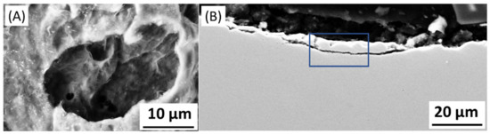 A pit was found on the surface of the material after testing in Reykjanes as seen in Figure 15A. Due to the naturally formed passivation layer on the 254SMO surface, pits grow under the surface layer [64]. The cross-section, in Figure 15B, shows a crack propagation at the subsurface which led to the breaking of the material causing direct exposure of the metal which could result in pit formation as seen in Figure 15A.