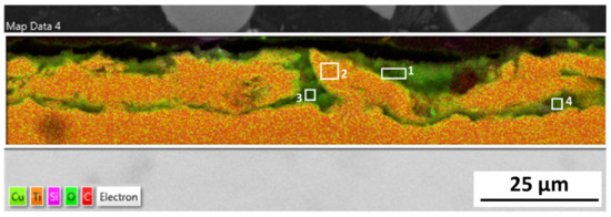 Ti gr. 2 is commercially pure, and is often preferred where high specific strength is needed [65]. The Ti gr. 2 naturally forms a TiO2 passivation layer of a few nm which protects the bulk material. However, due to the low thickness of the TiO2 passivation layer it can easily erode during exposure from the high velocity fluid which can contain abrasive particles. Figure 18 shows the sample after exposure where the affected area is evident. There were parallel subsurface cracks where the metal was adhering in a few contact points. The EDX revealed Cu deposits, which can be found at Reykjanes [66]. The cross-section clearly supports the observation of the topography, from Figure 7, where erosion has taken place at the surface as can be seen in Figure 18. The EDX analysis performed in between the loosely adhering Ti contained high wt.% of O and C, presented in Table 12. Due to the position of the point evaluation, it cannot be excluded that phenolic epoxy, the sample mounting material, contributed to the signal from C and O. The Ti gr. 2 has been reported to be successfully used in an oxygen rich environment [67,68,69]. However, in geothermal environments, where free O is limited, a Ti alloy might be better suitable.