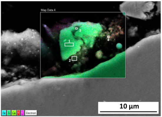 Ti gr. 2 after exposure at Chaunoy where there is visible detachment of Ti subsurface. The detached material is seen in location number 1. Furthermore, locations 2 and 4 contain Ti with high amounts of Fe and S. The colour map shows the relative composition of Fe, Ti, Ca, S and C in the material.