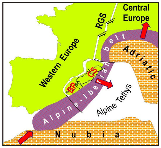 The fact that since the upper Oligocene transtensional tectonics in the Rhine graben system underwent a progressive attenuation (e.g., [105,110]) can be explained as an effect of the increasing bending of the Alpine–Iberian belt, which made the transmission of Nubian’s push less and less efficient.
