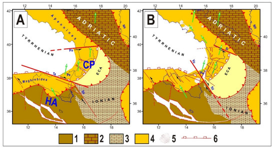 - The previous lateral guides of the Calabrian extrusion (Palinuro and Taormina fault systems) were deactivated, whereas two new lateral guides (Vulcano and Sibari fault systems) were activated (e.g., [198,199,234,235]).