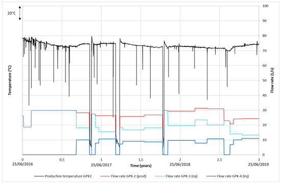 Operation data used for model calibration range from 25 June 2016 to 24 June 2019 (3 years). The average production rate is 25–30 L/s. Injection is 100% in GPK-3 until the beginning of March 2017 (almost 7 months) and is then split into GPK-3 and GPK-4 (see Figure 1).